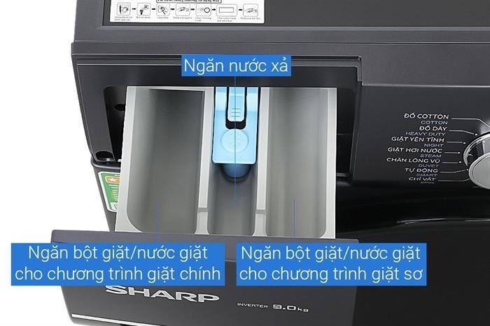 Máy giặt Sharp ES-FM90CB-SB có bảng điều khiển song ngữ Anh - Việt, giúp người dùng dễ thao tác. Máy được trang bị nhiều chương trình giặt đa dạng, đáp ứng từ nhu cầu giặt giũ cơ bản đến chuyên sâu như giặt đồ hỗn hợp, đồ trẻ em, giặt hơi nước,...